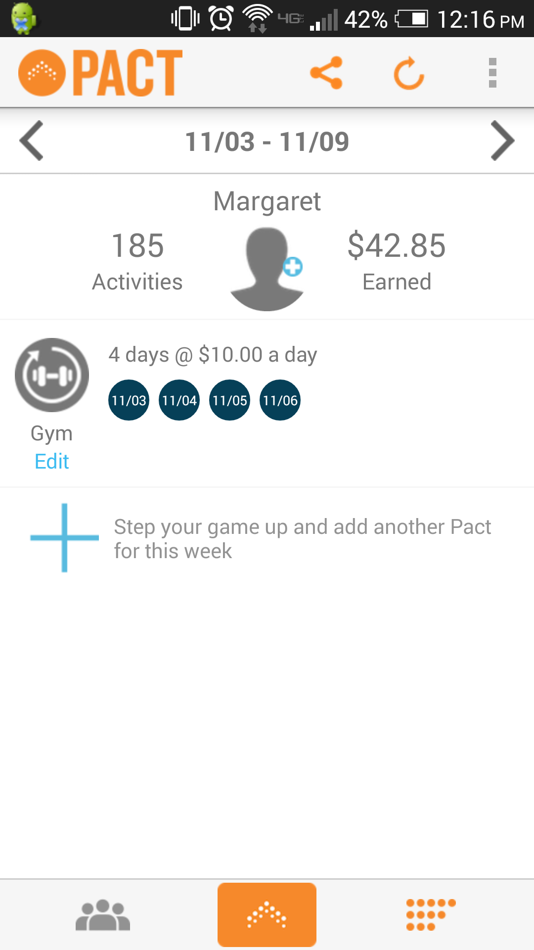 My other problem is forgetting to sign in. I have done that once or twice and missed making my goal for a week. That is a crushing feeling, especially when I have actually been at the gym! I think it would be cool to have Pact sync with my calendar and send me a reminder to check in when I get to a scheduled class. Maybe in the next update…